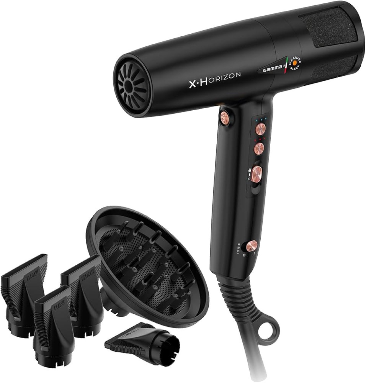 - Cuatro boquillas profesionales y un difusor incluidos para permitir diferentes opciones de peinado para todo tipo de cabello.