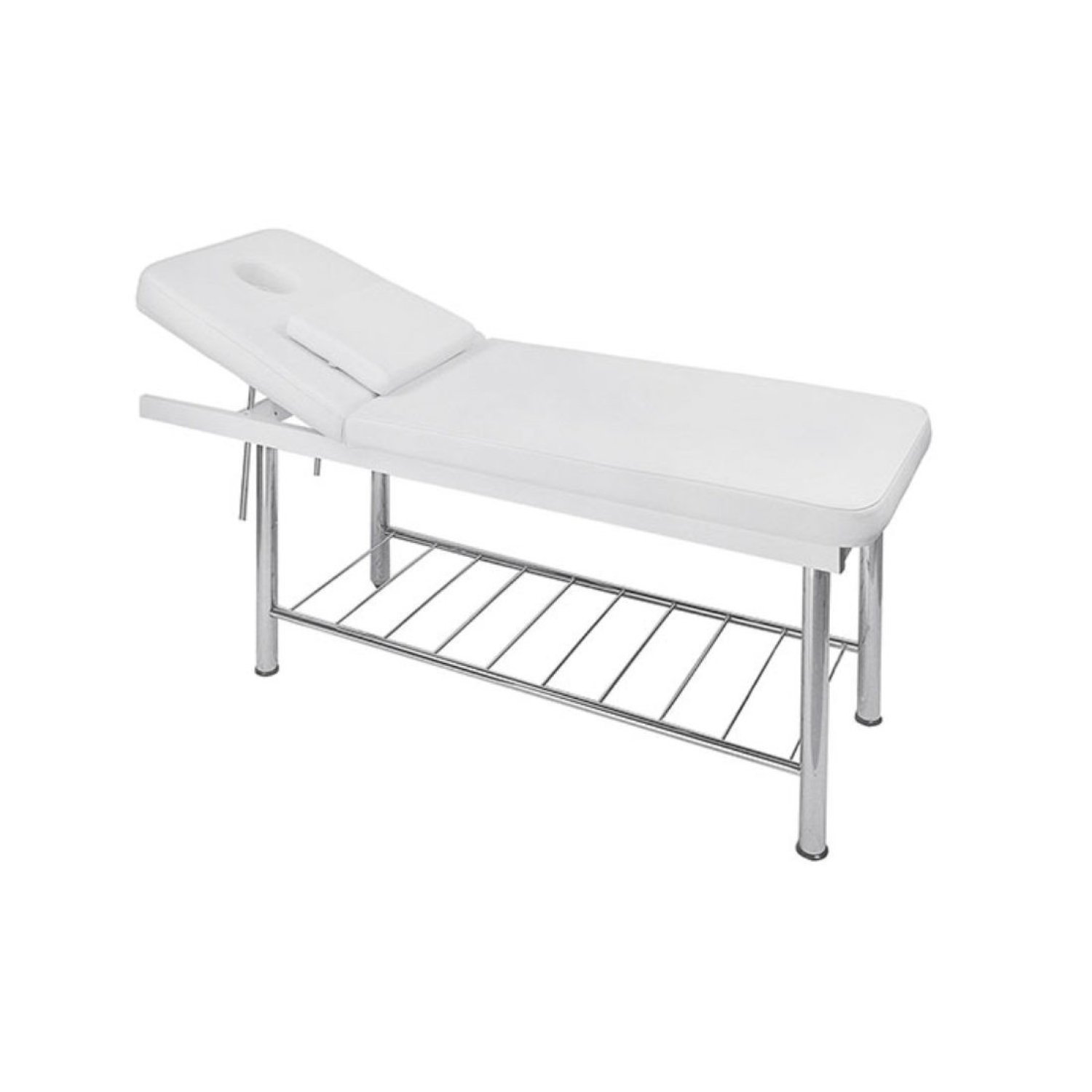 Camilla para masajes, tapizado PVC disponible en color blanco. Incluye agujero facial, cojín reposacabezas y portarrollos. El respaldo se puede inclinar hasta un ángulo de 50º.MEDIDAS: